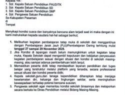 “Situasi cuaca beberapa hari terakhir sangat tidak stabil dan rawan menimbulkan bencana. Untuk itu, kami meminta seluruh sekolah menyesuaikan metode pembelajaran demi keselamatan bersama,” ujarnya dalam edaran tersebut.