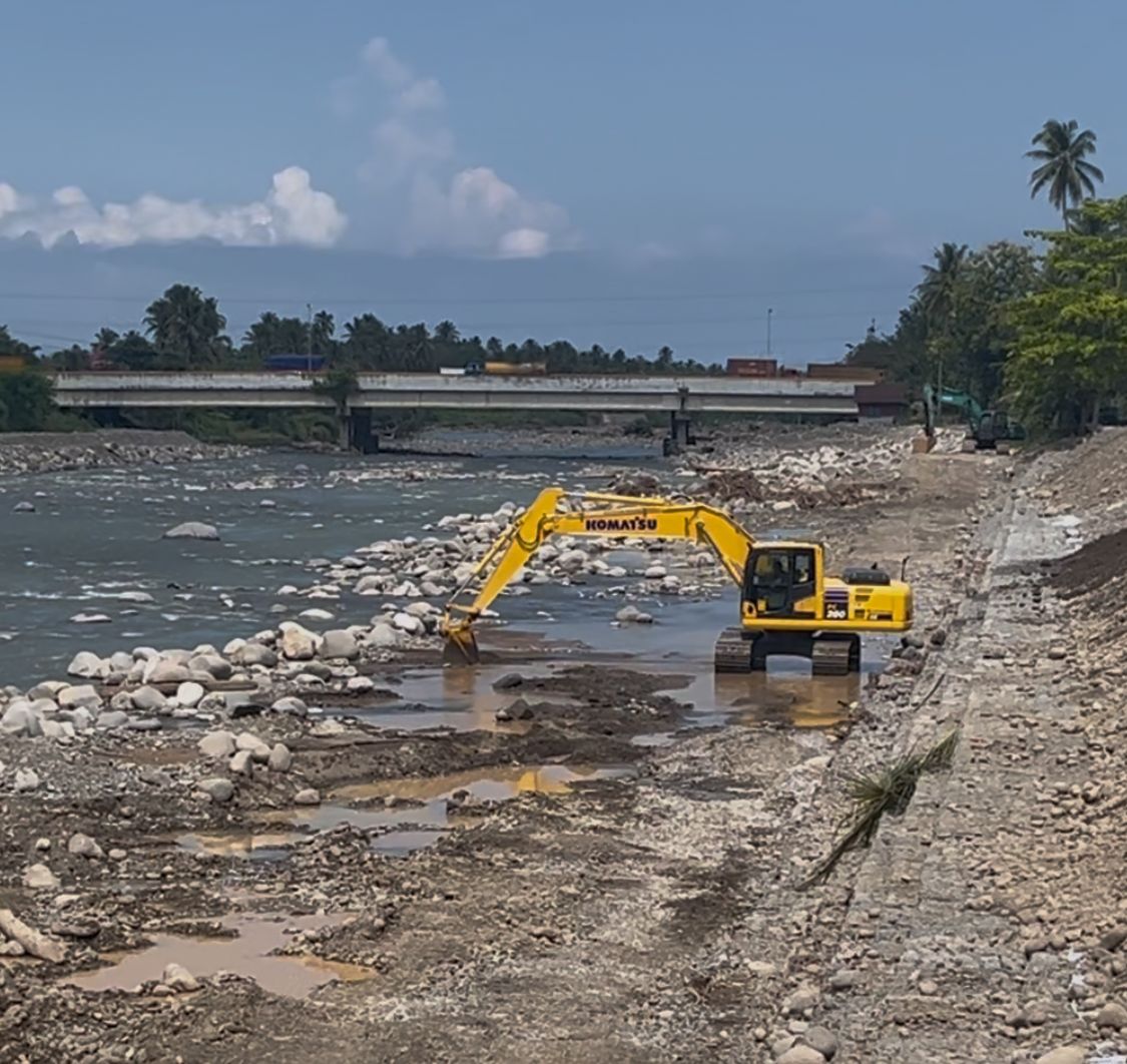 Deru alat berat berpadu dengan aliran sungai yang masih deras, menggambarkan upaya percepatan pemulihan pascabencana. Para pekerja terlihat sigap menyelesaikan setiap tahapan pekerjaan dengan tetap mengedepankan standar keselamatan kerja.