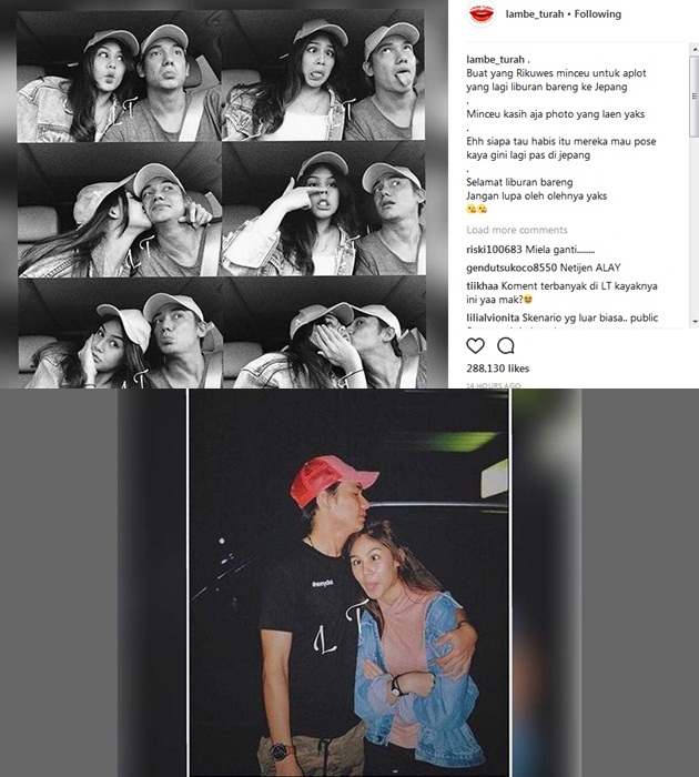 “Buat yang Rikuwes minceu untuk aplot yang lagi liburan bareng ke Jepang. Minceu kasih aja photo yang laen yaks,” bunyi caption Lambe Turah. “Ehh siapa tau habis itu mereka mau pose kaya gini lagi pas di jepang. Selamat liburan bareng. Jangan lupa oleh olehnya yaks.”