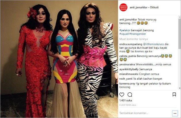 “Tebak mana yg benc*ng…???” tulis akun @anti_jamahliar dalam postingannya. “#pelakor berwajah benc*ng #squad #transgender.”