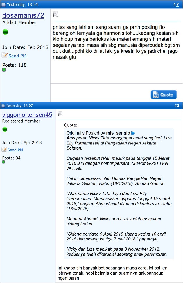 Netizen kemudian menebak-nebak alasan keduanya memilih bercerai. Sejumlah member di detikForum menduga kalau masalah ekonomi yang jadi penyebab. Netizen menilai kalau Liza punya gaya hidup yang glamor dan beda dengan Nicky.