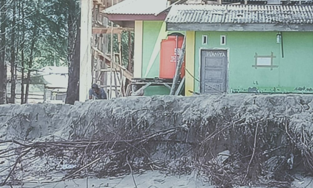 Disampaikannya bahwa abrasi pantai yang terus terjadi, tidak saja membuat lahan kelapa milik warga yang terseret ke laut, tapi juga telah merusak belasan rumah dan juga mengancam bangunan masjid.