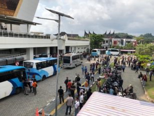 Sebelumnya, tujuh bus medium berjejer di kawasan Masjid Raya Sumbar untuk mengantar kepulangan demonstran Jorong Pigogah Patibubur, Nagari Air Bangis, Kecamatan Sei Beremas, Kabupaten Pasaman Barat.