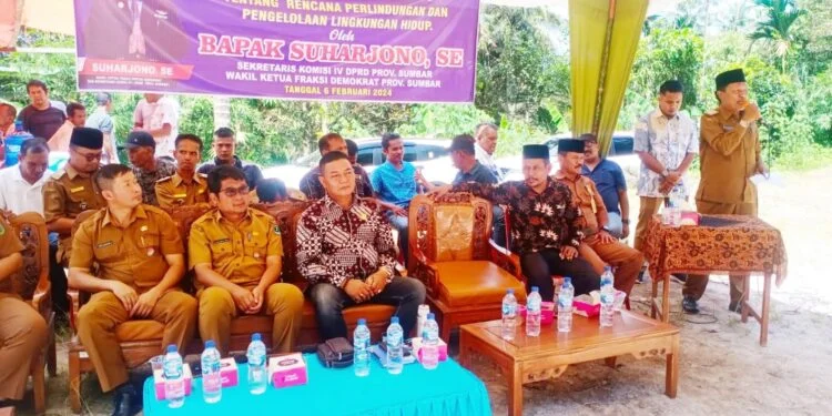 Sekretaris Komisi IV Dewan Perwakilan Rakyat Daerah (DPRD) Provinsi Sumatera Barat (Sumbar), Suharjono melaksanakan sosialisasi Peraturan Daerah (Perda) No 2 Tahun 2020 tentang Rencana Perlindungan dan Pengelolaan Lingkungan Hidup di di Jorong Batu Badinding, Nagari Limo Koto, Kecamatan Bonjol, Kabupaten Pasaman, Selasa (6/2/2024).