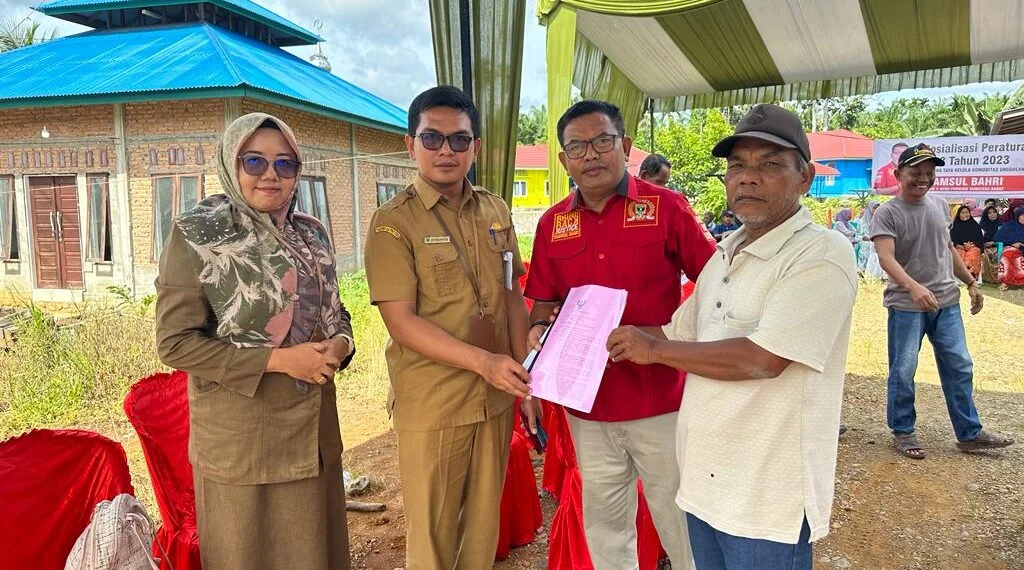 Anggota DPRD Sumbar, Syamsul Bahri, menyosialisasikan Perda Nomor 3 Tahun 2023 tentang Tata Kelola Komoditas Unggulan Perkebunan Sumatera Barat pada masyarakat Air Bangis, Kecamatan Sungai Beremas, Pasaman Barat, Selasa (6/2/2024).