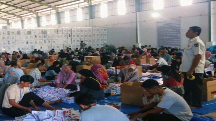Penyortiran dan lipat surat suara satu kotak ini melibatkan tiga orang.