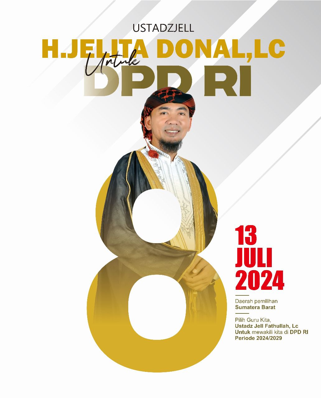 “Ingat, jangan lupa tanggal 13 Juli 2024 coblos nomor 8, Ustaz Jelita Donal, calon DPD RI 2024-2029, terima kasih,” kata Anggota Dewan Pembina DPP Partai Gerindra tersebut.