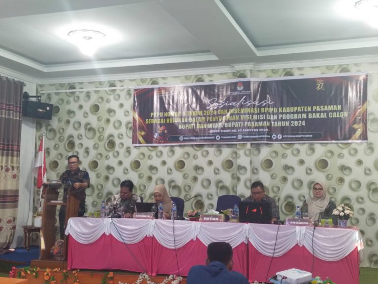 Pasaman, Kabarins.com – Komisi Pemilihan Umum (KPU) Kabupaten Pasaman menggelar sosialisasi Peraturan Komisi Pemilihan Umum Nomor 8 tahun 2024 dan Diseminasi RPJPD Kabupaten Pasaman sebagai rujukan dalam penyusunan Visi, Misi dan program bakal calon Bupati dan Wakil Bupati Pasaman Tahun 2024.