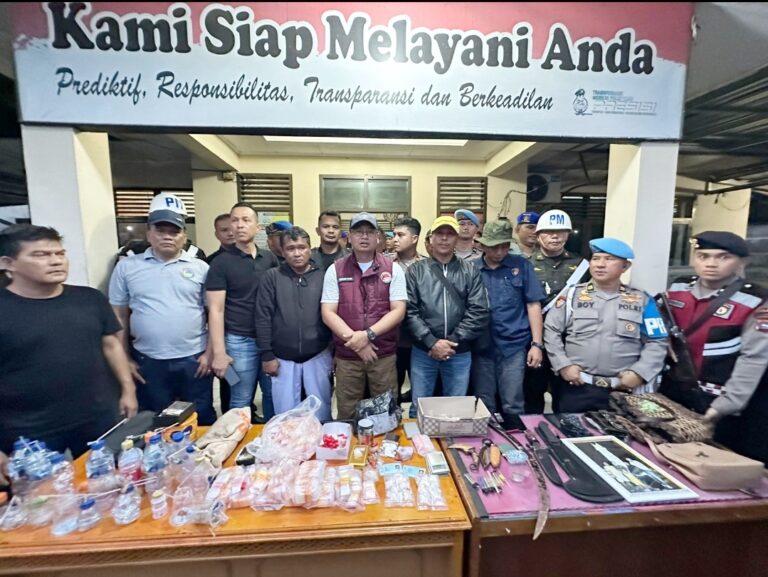 Petugas juga menyita barang bukti berupa sabu, plastik klip, bong bekas pakai, senjata tajam, beberapa handphone, timbangan digital, dan barang-barang lain yang berkaitan dengan kasus narkoba.