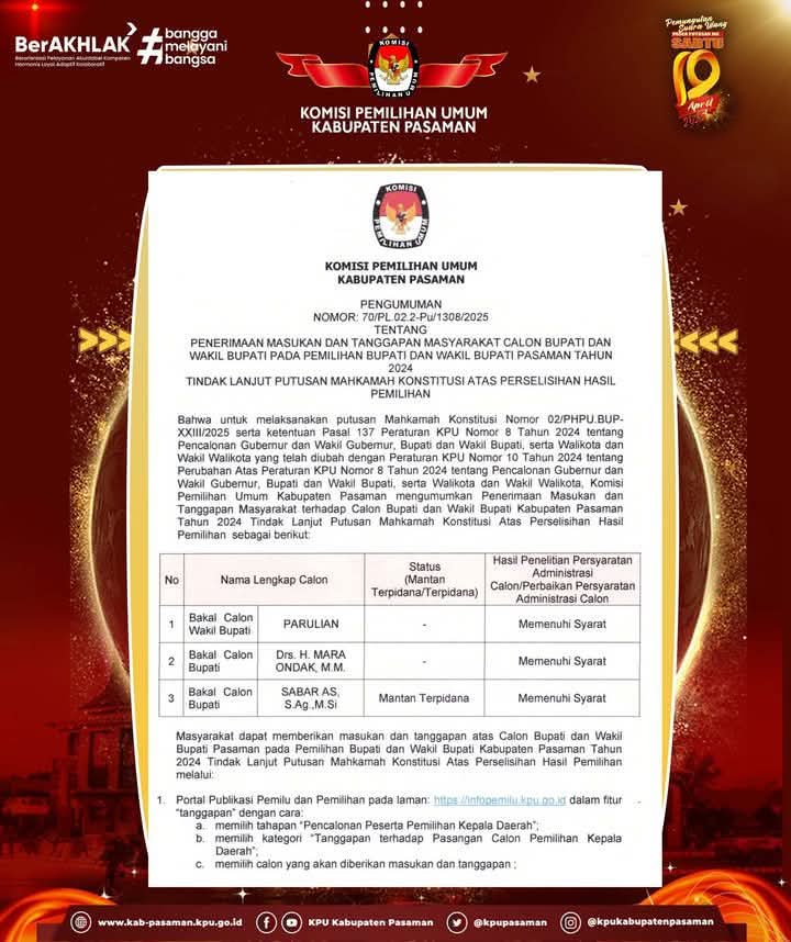 Pasaman, kabarins.com – Komisi Pemilihan Umum (KPU) Kabupaten Pasaman resmi mengumumkan hasil pemeriksaan administrasi calon Bupati dan Wakil Bupati Pasaman dalam Pilkada 2024. Berdasarkan pengumuman KPU Nomor 770/PL.02.2-Pu/1308/2025, salah satu bakal calon Bupati, Parulian, dinyatakan memenuhi syarat administrasi.