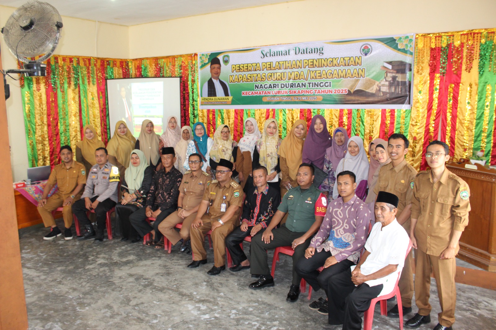 Pasaman, Kabarins.com—Bintara Pembina Desa (Babinsa) Koramil 01/Lubuk Sikaping, Kodim 0305/Pasaman, Kopda Ichsan Fajar Habibullah menghadiri pelatihan peningkatan kapasitas guru Madrasah Diniyah Awaliyah (MDA) se-Nagari Durian Tinggi.