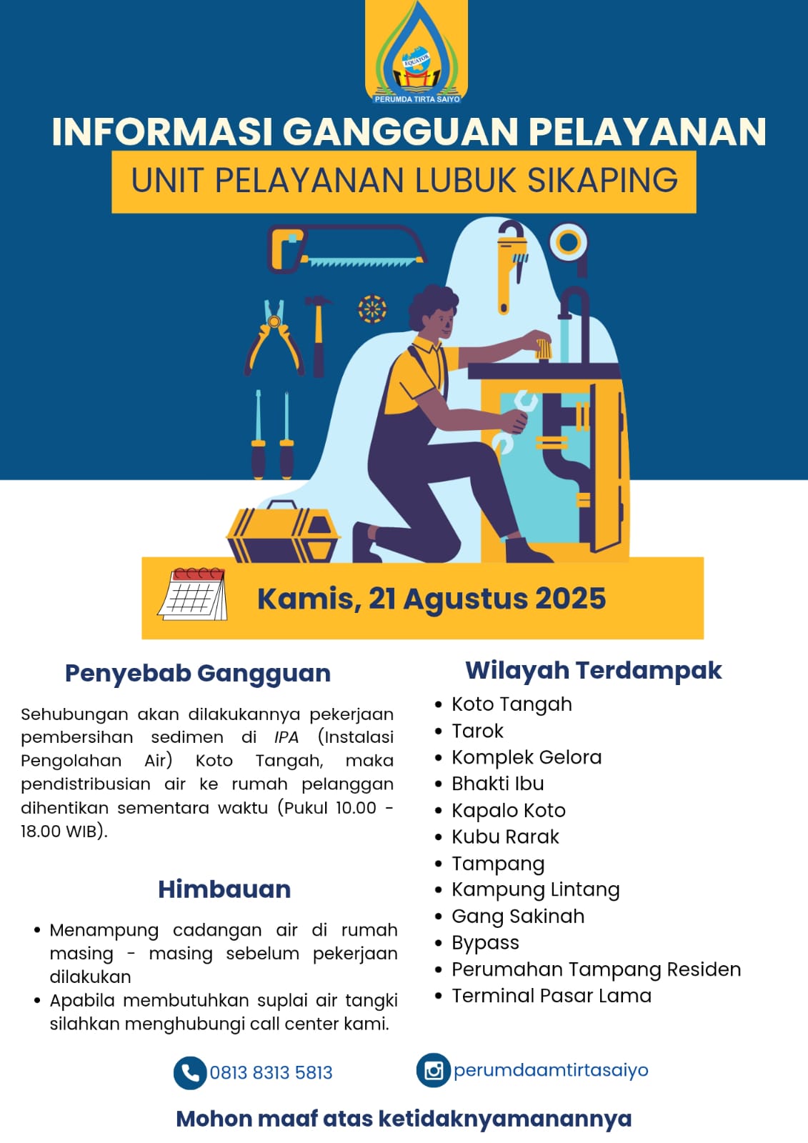Perumda Tirta Saiyo juga mengimbau pelanggan agar menyiapkan cadangan air lebih dulu. Jika masih membutuhkan tambahan suplai, masyarakat bisa menghubungi call center 0813 8313 5813 untuk permintaan melalui mobil tangki.