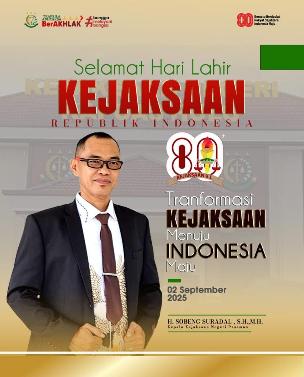 “Peringatan HUT Kejaksaan RI ke-80 ini adalah kesempatan bagi kami untuk mempercepat transformasi kelembagaan. Harapan kami, Kejaksaan dapat hadir sebagai institusi modern, profesional, dan dipercaya masyarakat dalam menegakkan keadilan,” ungkap Sobeng Suradal