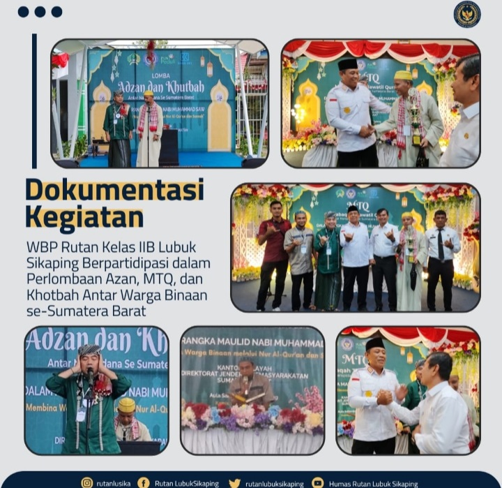 Pasaman, Kabarins.com – Warga Binaan Pemasyarakatan (WBP) Rutan Kelas IIB Lubuk Sikaping berhasil menorehkan prestasi pada ajang perlombaan Azan, Musabaqah Tilawatil Qur’an (MTQ), dan Khotbah antar WBP se-Sumatera Barat yang digelar di Lapas Kelas IIA Padang, Kamis (11/9/2025).