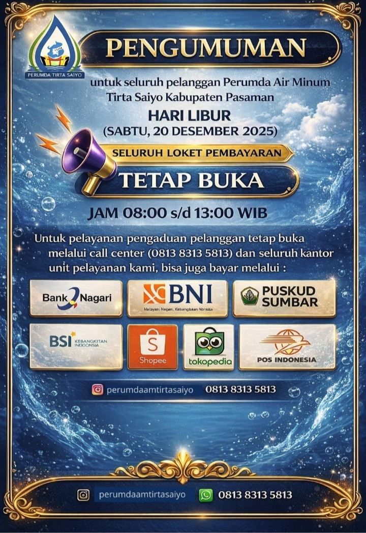 Perumda Air Minum Tirta Saiyo mengajak seluruh pelanggan untuk memanfaatkan layanan yang tersedia serta tetap mengikuti informasi resmi melalui media sosial @perumdaamtirtasaiyo atau saluran komunikasi yang telah disediakan. (Joni)