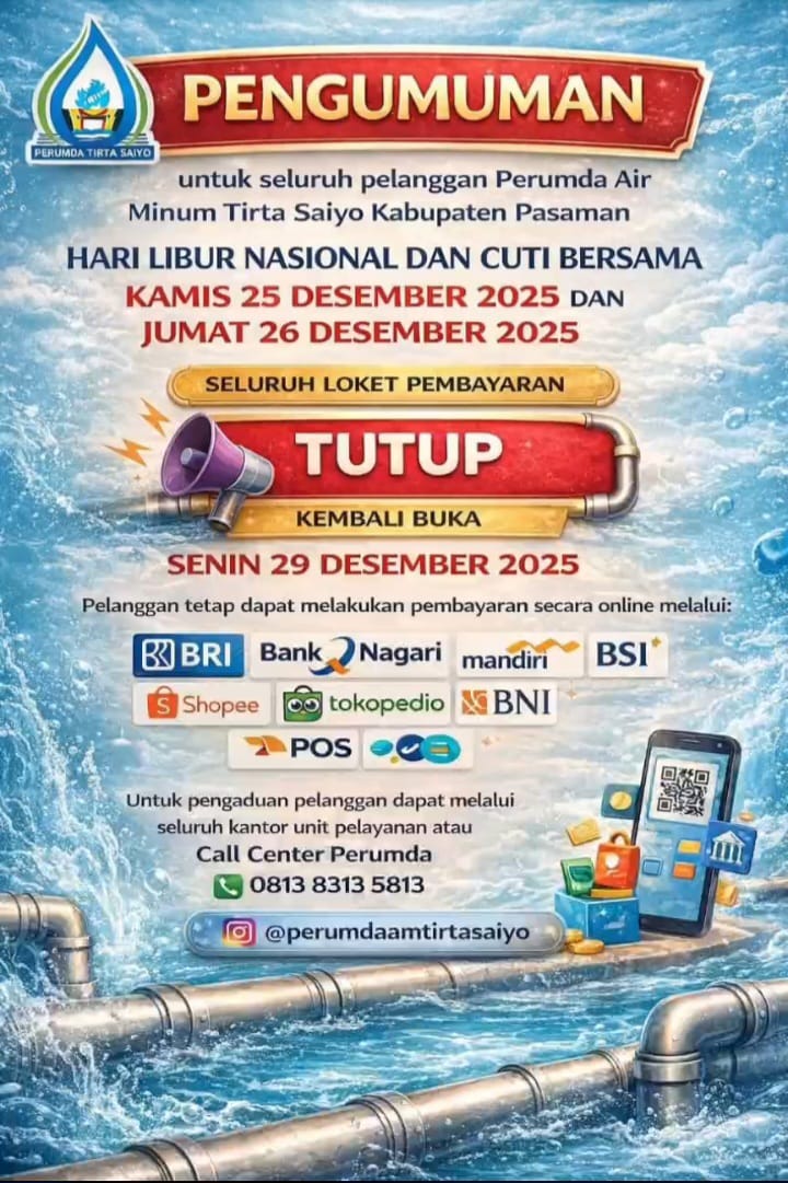 Direktur Perumda Air Minum Tirta Saiyo Pasaman, Deddy Eka Putra, menyampaikan bahwa penutupan loket pembayaran akan berlangsung selama dua hari, yakni Kamis, 25 Desember 2025 dan Jumat, 26 Desember 2025. Seluruh loket pembayaran akan kembali beroperasi secara normal pada Senin, 29 Desember 2025.