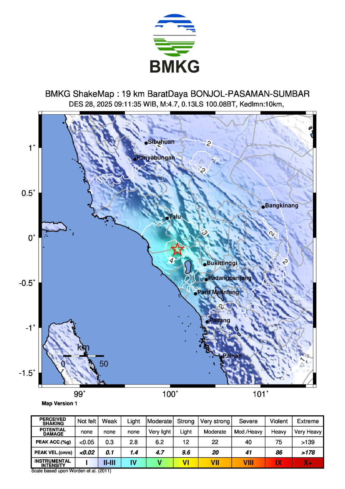 Pasaman, Kabarins.com — Gempa bumi tektonik dengan magnitudo 4,7 mengguncang wilayah Bonjol, Kabupaten Pasaman, Sumatera Barat, pada Minggu pagi, 28 Desember 2025, sekitar pukul 09.11 WIB. Badan Meteorologi, Klimatologi, dan Geofisika (BMKG) memastikan gempa tersebut tidak berpotensi menimbulkan tsunami.