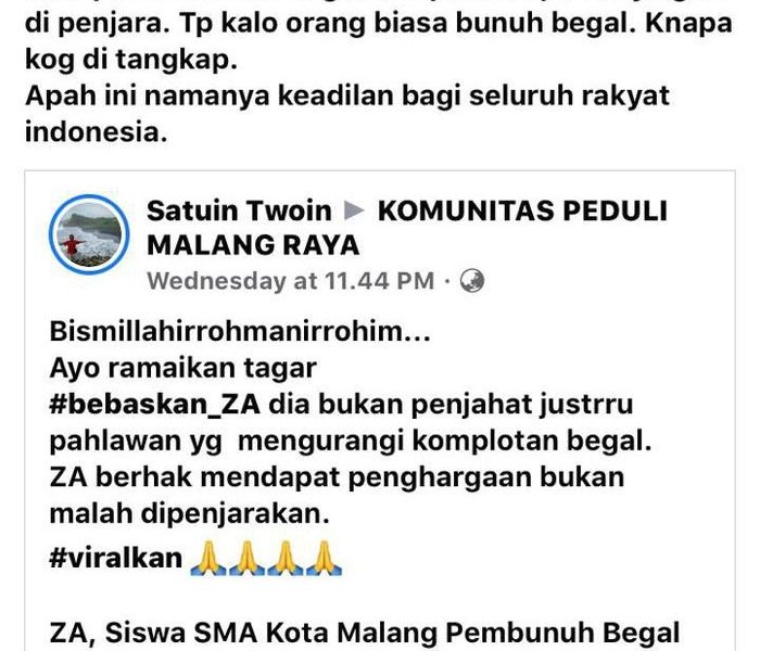 Sebuah postingan menghina polisi viral di Facebook. Posting-an itu berisi ketidakpuasan netizen pada penanganan kasus pelajar yang membunuh begal di Malang.