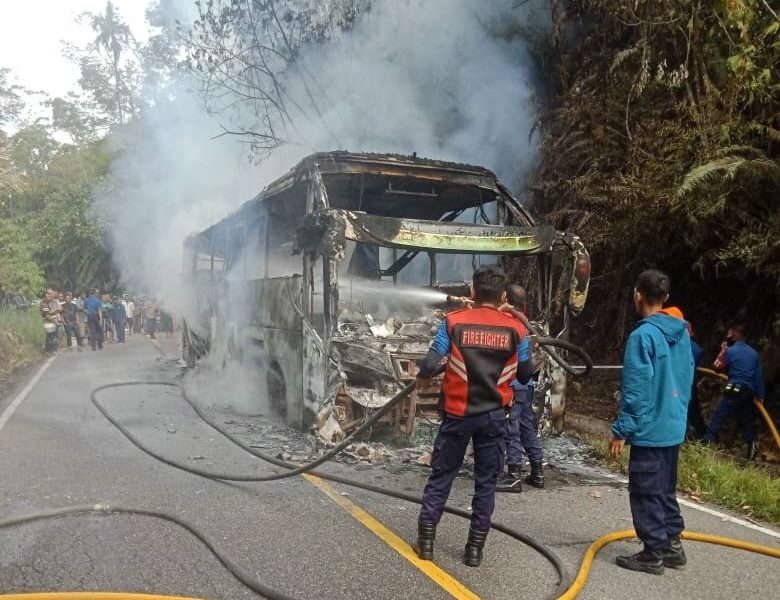 Bus bernomor polisi BK 7285 LD itu terbakar pada Senin (13/32023). Bus dilaporkan berisi 20 orang yang terdiri dari 16 penumpang, satu sopir dan tiga kernet.