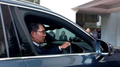Dia terlihat mengenakan setelan jas hitam.”Nyetir sendiri dari Bandung,” ujar RK kepada wartawan