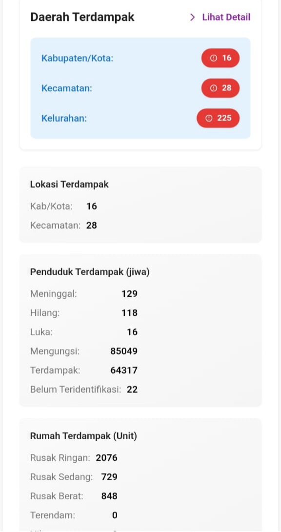 Bantuan yang disalurkan mencakup sembako, perlengkapan kebersihan, makanan siap saji, selimut, tenda, serta alat berat seperti excavator. Seluruh personel BNPB telah berada di titik-titik terdampak untuk mendampingi Forkopimda.